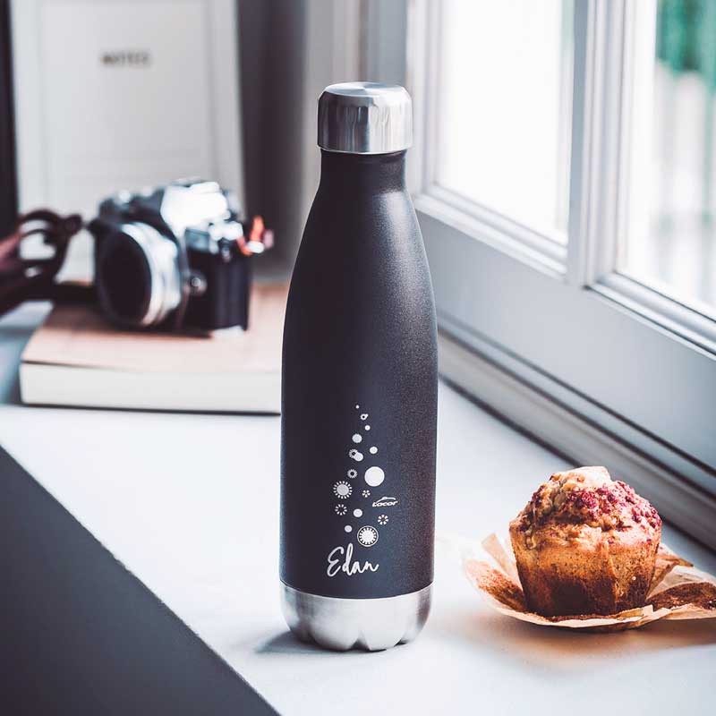 Botella de acero inoxidable con tapa hermética modelo Edan Black para llevar y mantener bebidas calientes o frías.