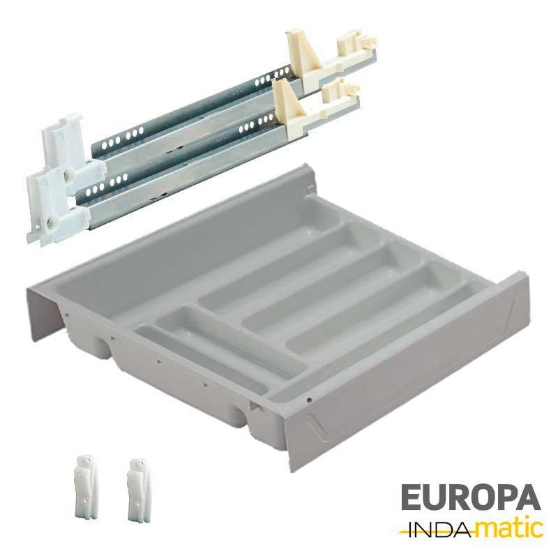 Cajón de PVC inyectado gris (RAL 7040) con cubertero y guías de extracción parcial para muebles de 50 cm mínimo de fondo interior.