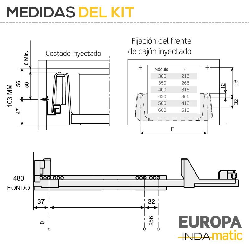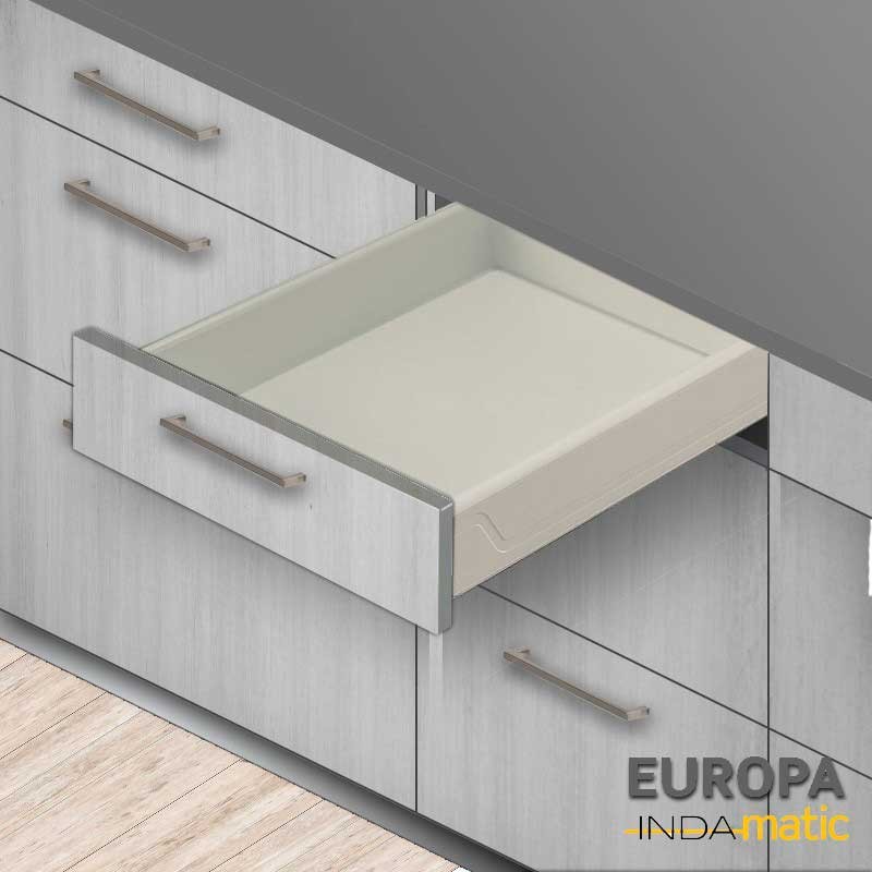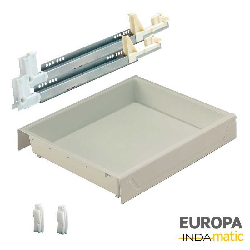 Cajón de PVC inyectado blanco (RAL 9001) con guías de extracción parcial para muebles de 50 cm mínimo de fondo interior.