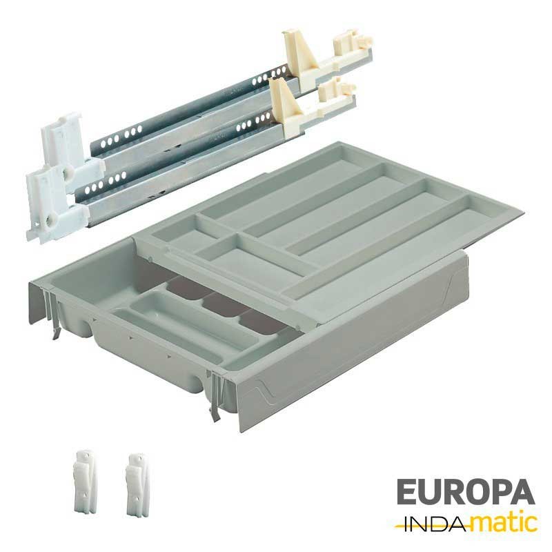 Cajón de PVC inyectado gris (RAL 7040) con doble cubertero y guías de extracción parcial para muebles de 50 cm mínimo de fondo interior.