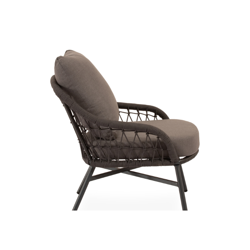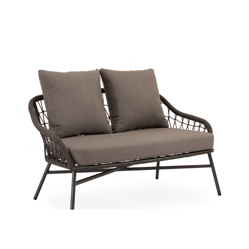 Compuesto por dos sillones, un sofá doble y una mesa de centro con tapa de cristal templado de 5 mm de grosor, este set ofrece una estética delicada y acogedora. Su estructura de acero galvanizado combina a la perfección con la cuerda trenzada a mano, creando un diseño fluido y contemporáneo.