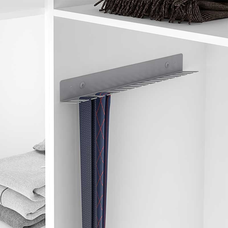 Soporte perchero para armario vestidor fabricado en acero plata o antracita a elegir con capacidad para colgar hasta 18 corbatas o cinturones.