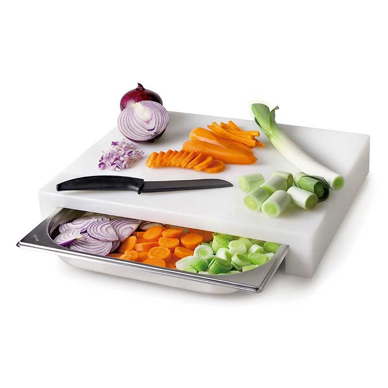 Tabla de corte de polietileno de alta densidad con una cubeta integrada GN 2/3 de acero inoxidable oculta y completamente extraíble.