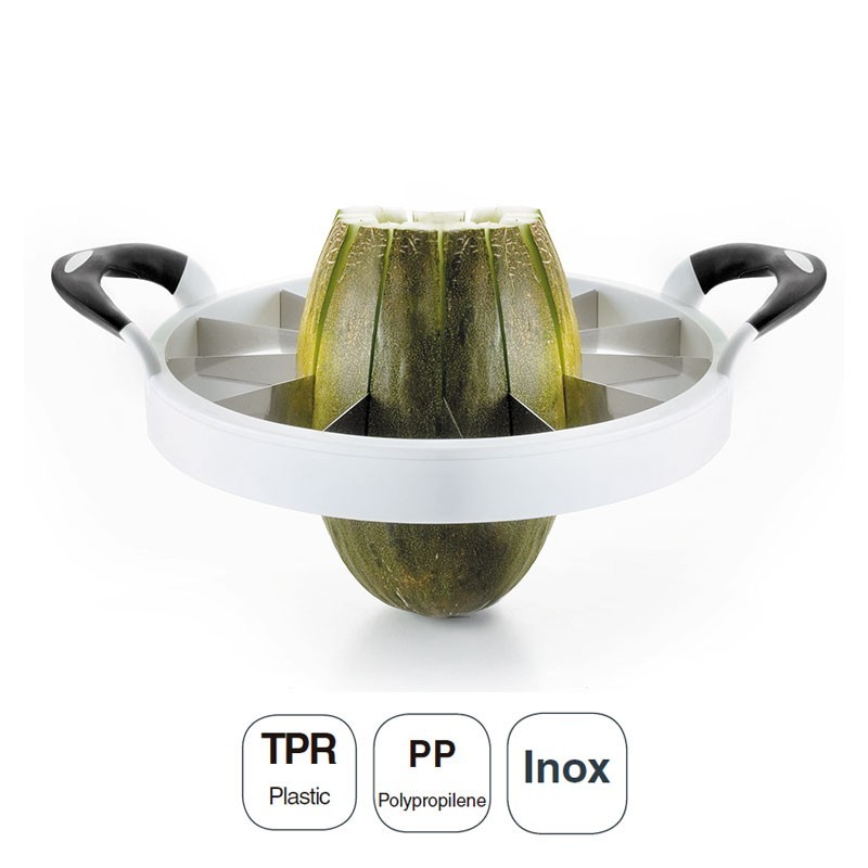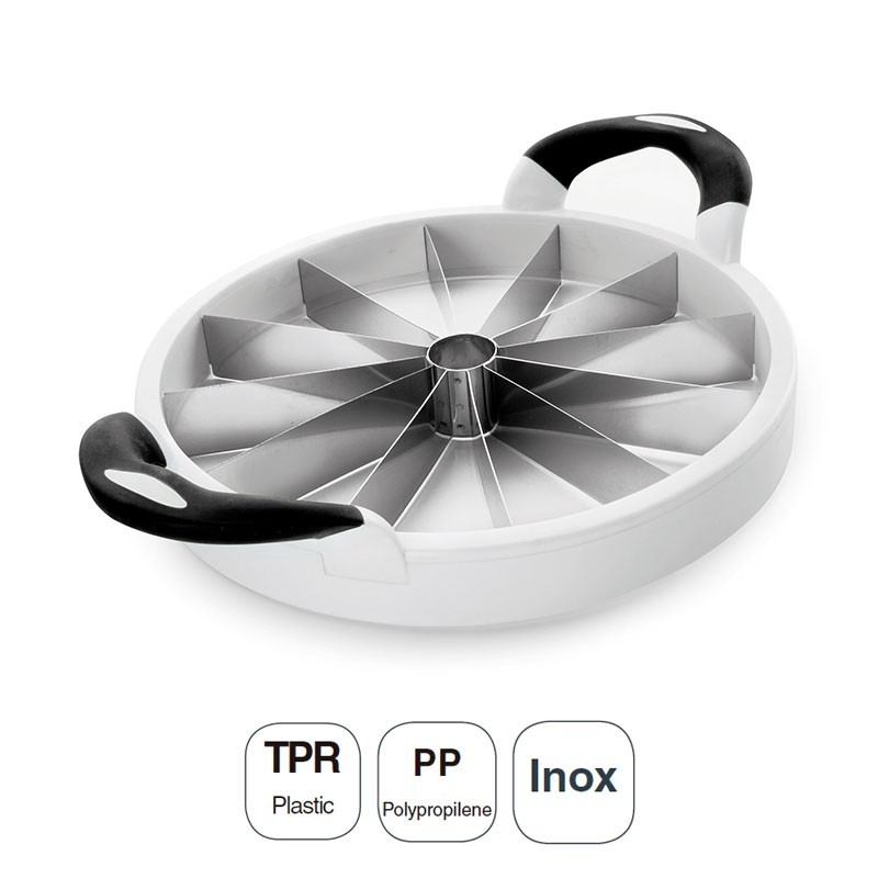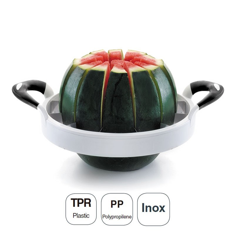 Cortador en rodajas para melones y sandías fabricado con cuchillas de acero inoxidable, cuerpo de polipropileno y asas de plástico TPR. Medida Ø: 28 cm.