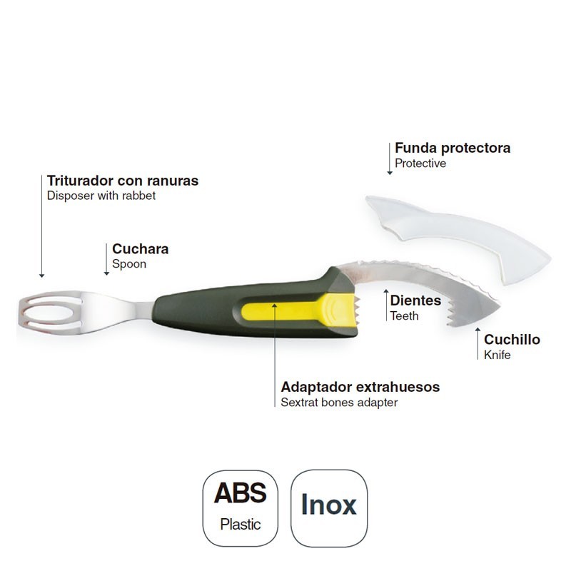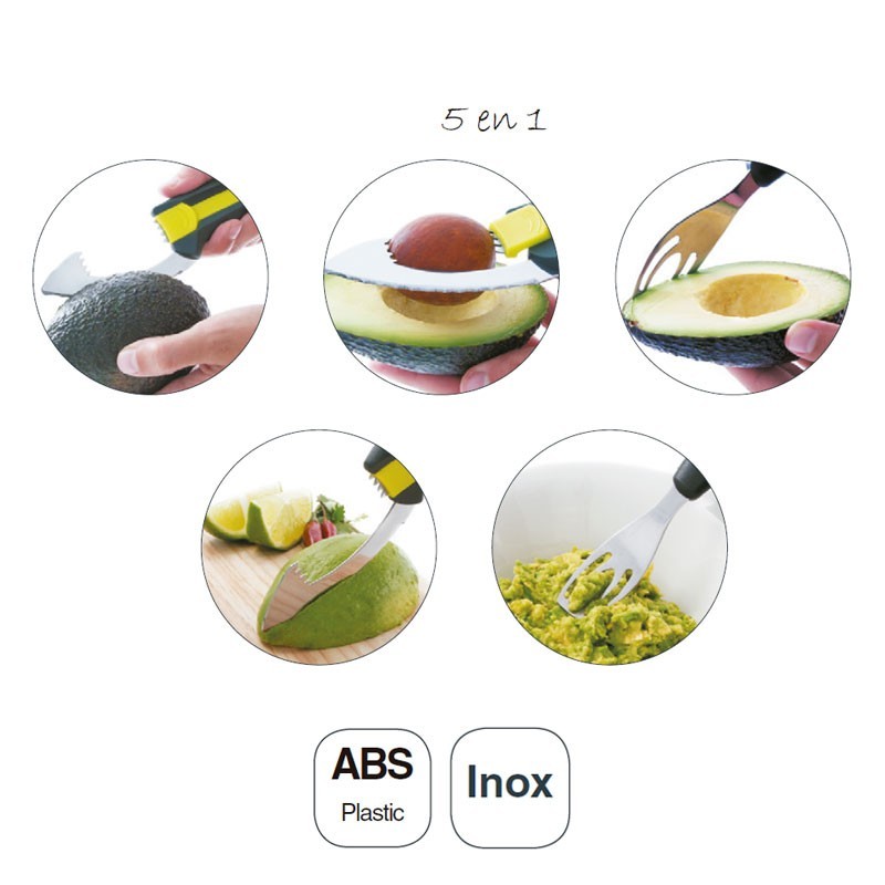 Pelador 5 en 1 para aguacates con triturador, cuchara, extractor de huesos, dientes y cuchillo con funda protectora. Medida: 24x24 cm.