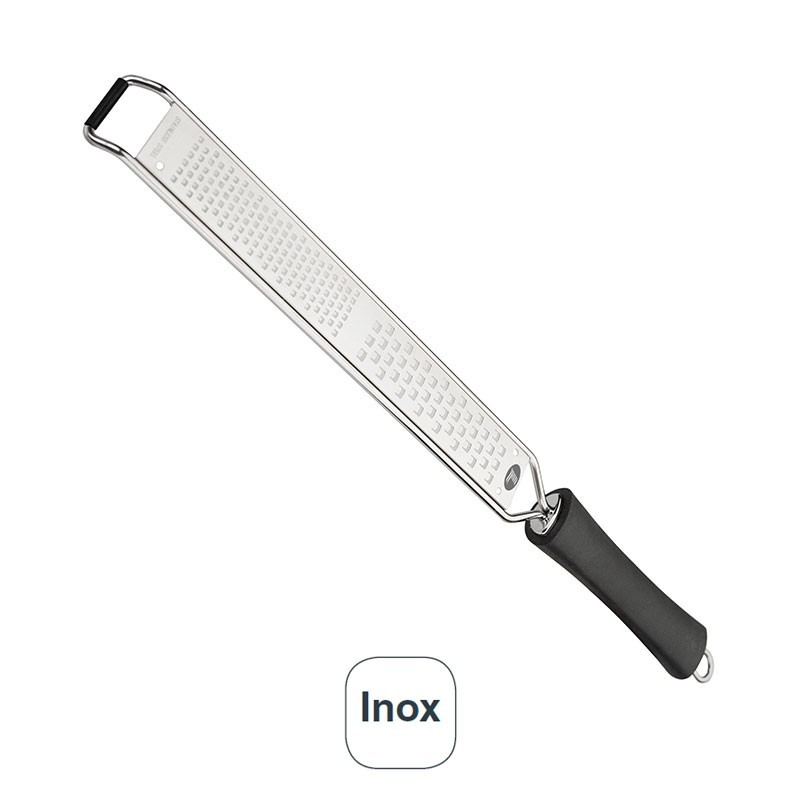 Rallador largo con mango y doble paso (fino y medio) fabricado en acero inoxidable 18/10 de alta calidad y excelente resistencia a la corrosión.