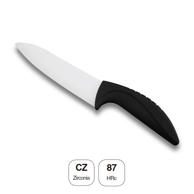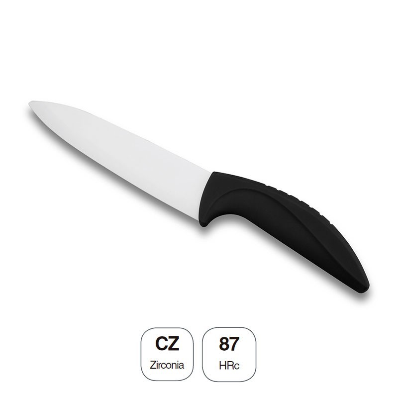 Cuchillo cerámico con hoja de zirconia de dureza 87 HRc con funda protectora incluida y un diseño moderno e innovador con mango antideslizante.