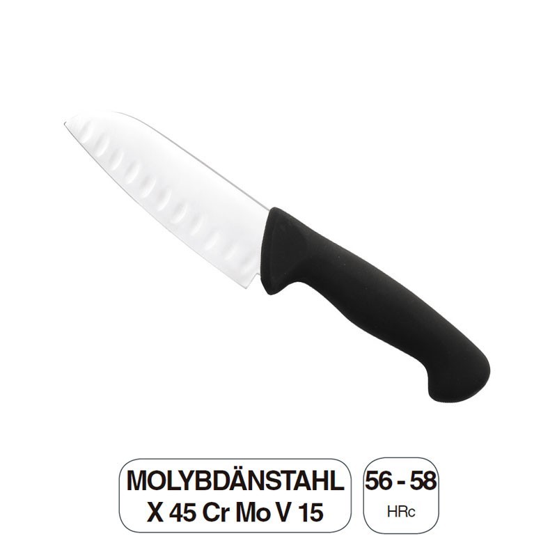 Cuchillo Santoku de cocina serie Profesional con hoja forjada Molybdänstahl X 45 Cr Mo V 15 de dureza 56-58 HRc y mango antideslizante. Disponible en varias medidas.