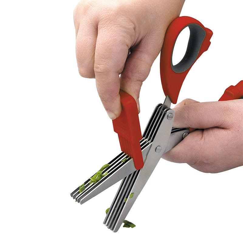Tijeras multicorte de 27x13x3 cm en acero inoxidable de gran calidad ideal para obtener un picado de verduras, hortalizas u otros productos de forma sencilla y rápida. Incluye cepillo para limpiar los restos adheridos entre las cuchillas.