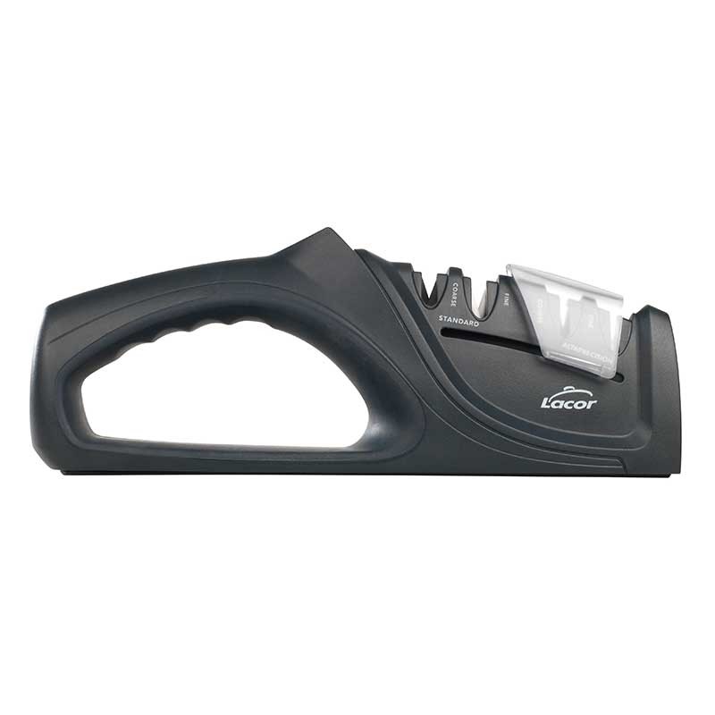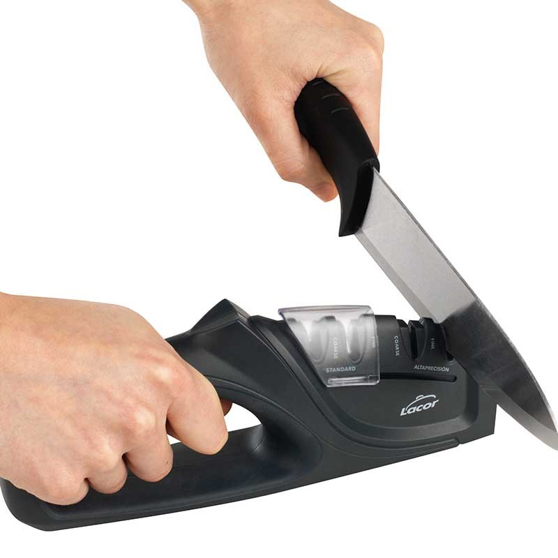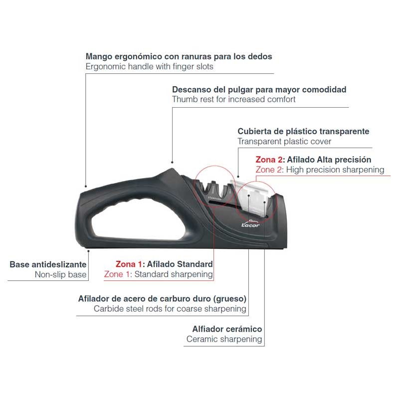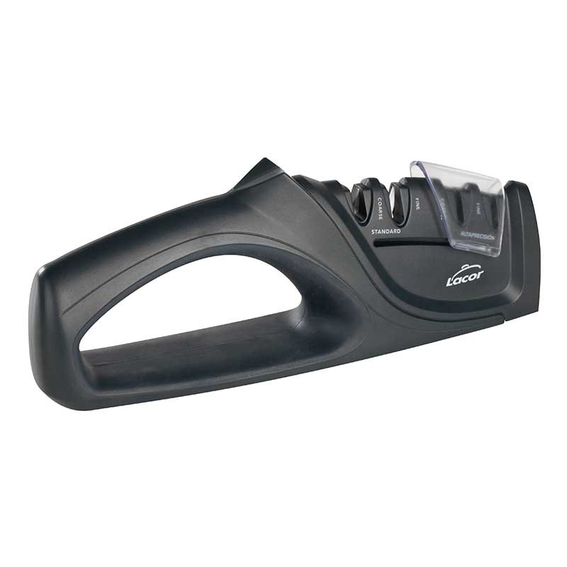 Afilador manual para cuchillos de filo liso modelo DUAL con 2 zonas de afilado y 2 discos por zona para un afilado estándar o de alta precisión.