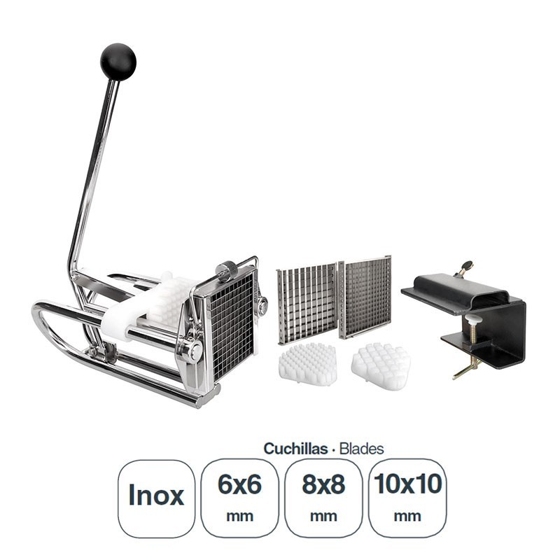 Corta patatas tipo chip profesional con 3 cuchillas diferentes fabricado en acero inoxidable 18/10 de alta calidad y excelente resistencia a la corrosión.