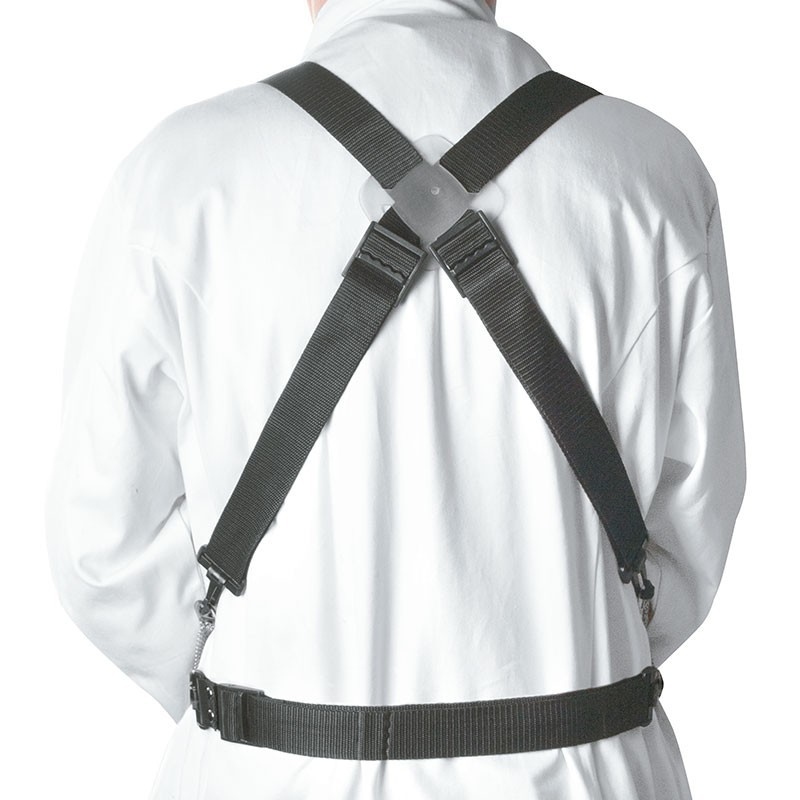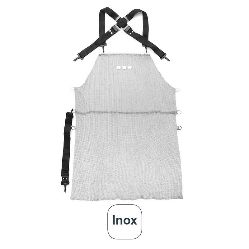 Delantal profesional de cota de malla anticorte de acero inoxidable con tirantes ajustables de sujección verticales y horizontales.