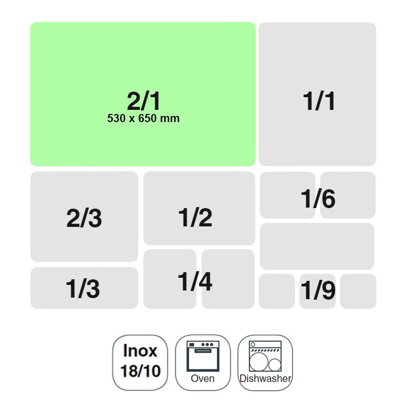 Cubeta o bandeja perforada tamaño GN 2/1 de 530x650 mm para cocinas profesionales fabricada en acero inoxidable 18/10.