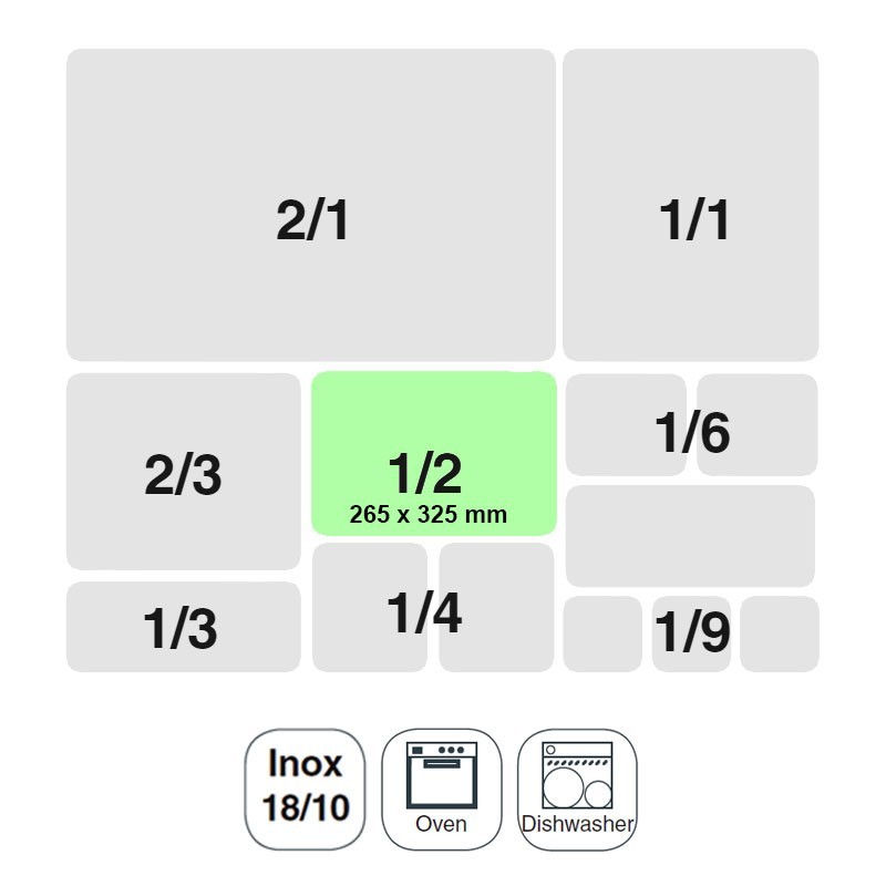 Cubeta o bandeja perforada tamaño GN 1/2 de 265x325 mm para cocinas profesionales fabricada en acero inoxidable 18/10.