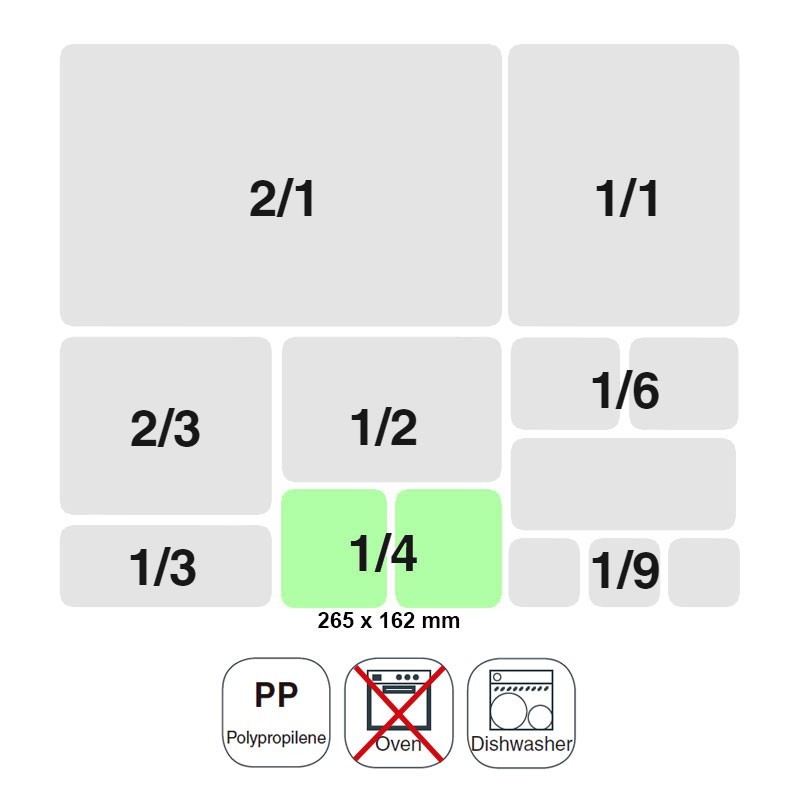 Cubeta tamaño GN 1/4 de 265x162 mm para cocinas profesionales fabricada en polipropileno de gran calidad indeformable y ligero.