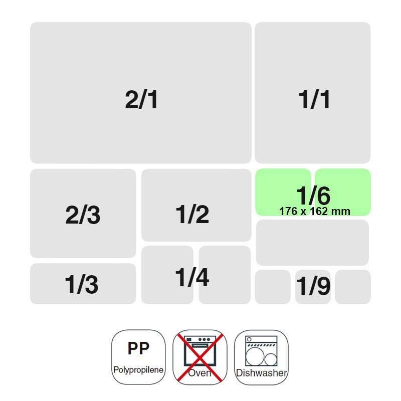 Cubeta tamaño GN 1/6 de 176x162 mm para cocinas profesionales fabricada en polipropileno de gran calidad indeformable y ligero.