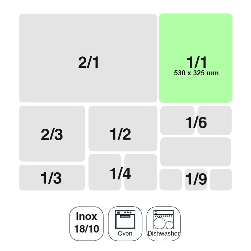 Cubeta o bandeja tamaño GN 1/1 de 530x325 mm para cocinas profesionales fabricada en acero inoxidable 18/10.