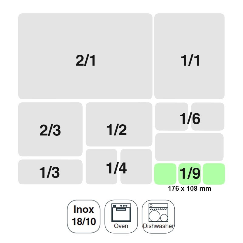 Cubeta tamaño GN 1/9 de 176x108 mm para cocinas profesionales fabricada en acero inoxidable 18/10.
