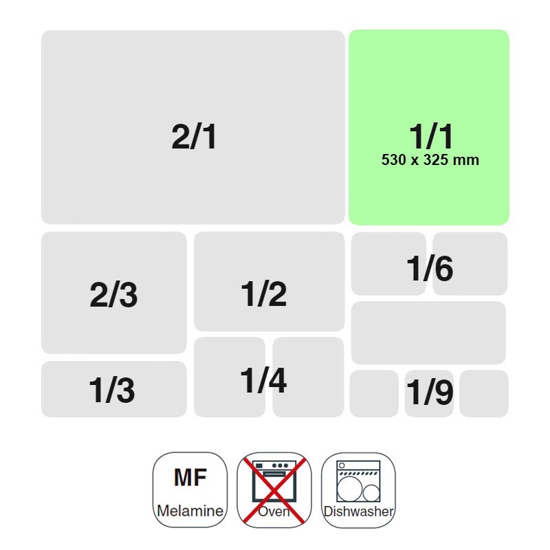 Cubeta tamaño GN 1/1 de 530x325 mm para cocinas profesionales fabricada en resina sintética negra de alta calidad y resistencia.