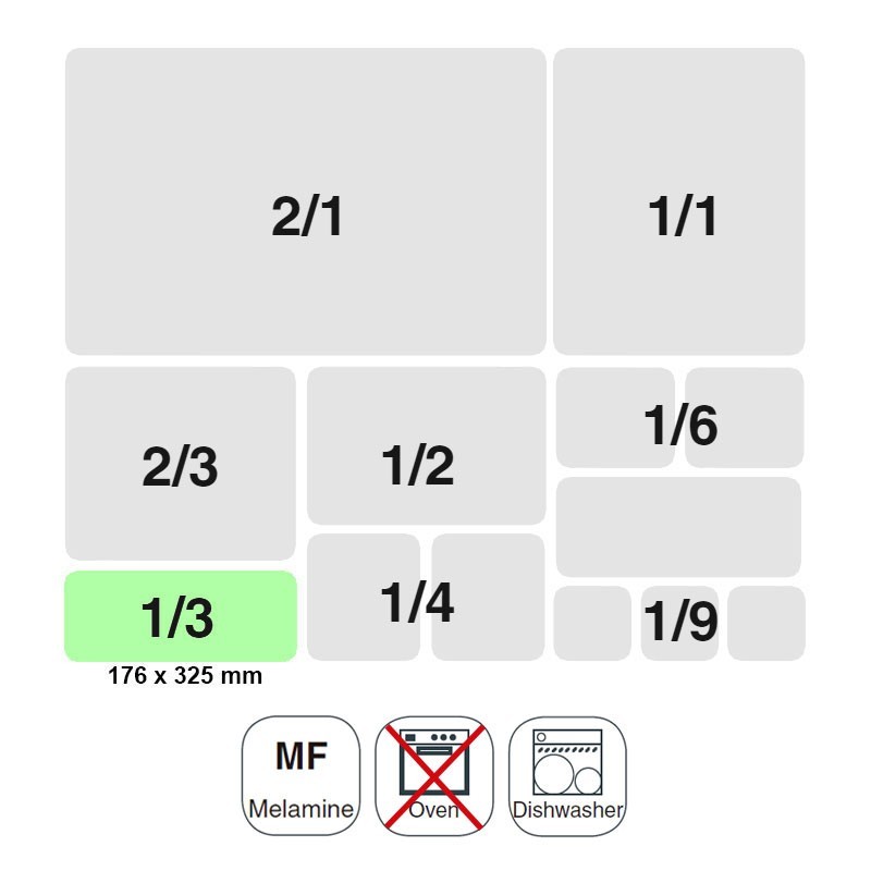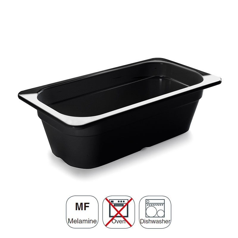 Cubeta tamaño GN 1/3 de 176x325 mm para cocinas profesionales fabricada en resina sintética negra de alta calidad y resistencia.