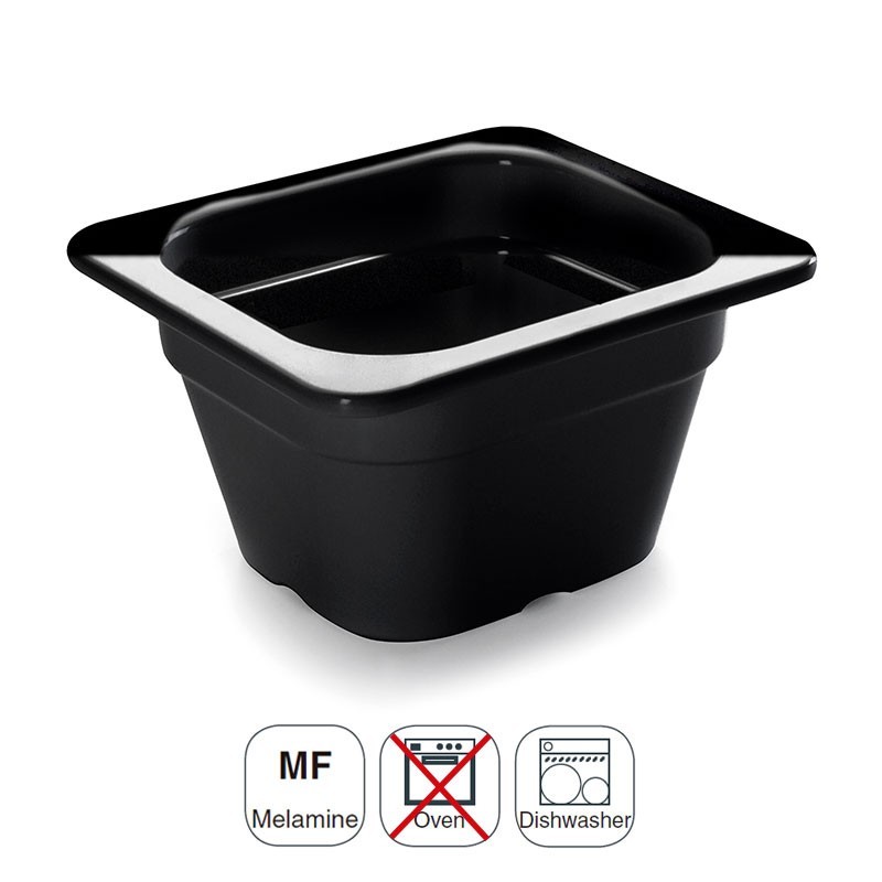 Cubeta tamaño GN 1/6 de 176x162 mm para cocinas profesionales fabricada en resina sintética negra de alta calidad y resistencia.