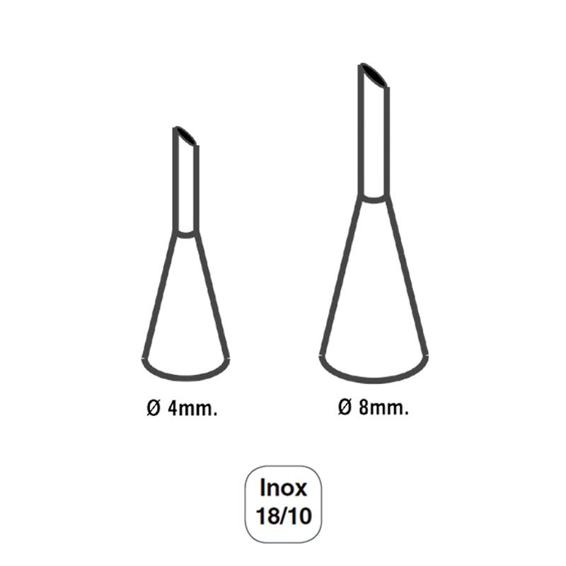 Set de 2 boquillas de repostería para rellenos con manga pastelera fabricadas en acero inoxidable 18/10 de alta calidad y resistencia a la corrosión. Medidas: 6 y 8 mm.