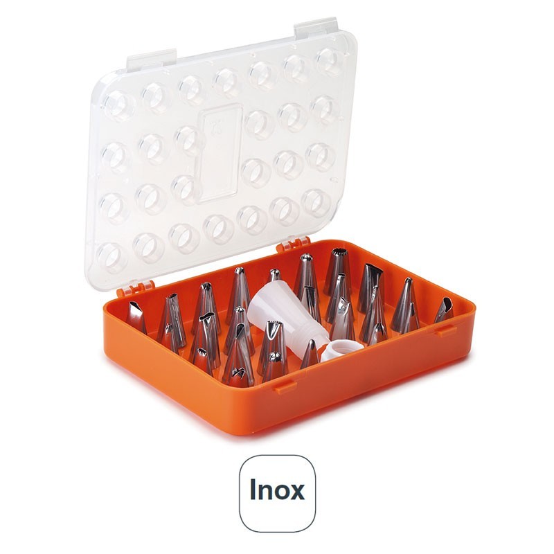 Estuche con 26 boquillas de repostería variadas para decorar con manga pastelera, fabricadas en acero inoxidable de gran calidad.