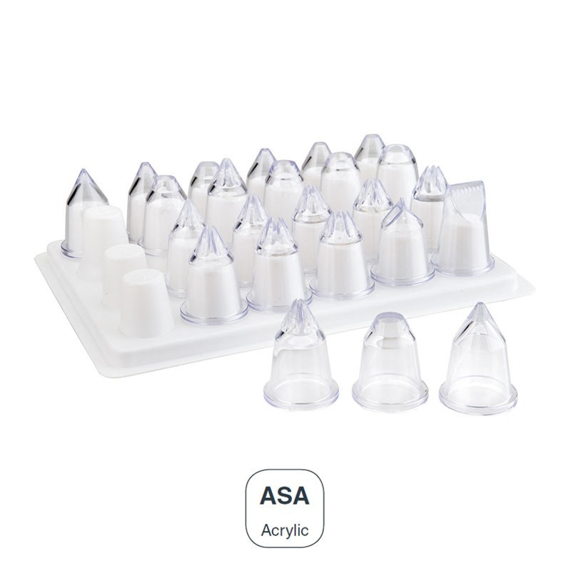 Set con 24 boquillas de repostería variadas para decorar con manga pastelera, fabricadas en plástico acrílico de alta calidad y resistencia.