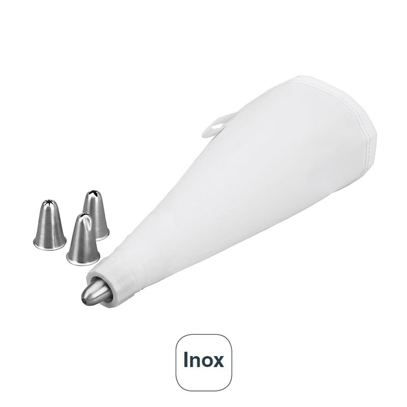 Manga pastelera de 20 cm de largo con 4 boquillas intercambiables de 20x30 mm de diámetro fabricadas en acero inoxidable de gran calidad.