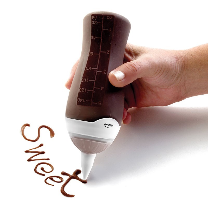 Biberón de 5,5x16 cm y 140 ml de capacidad fabricado en silicona con 5 boquillas diferentes para decoración en elaboraciones de repostería.