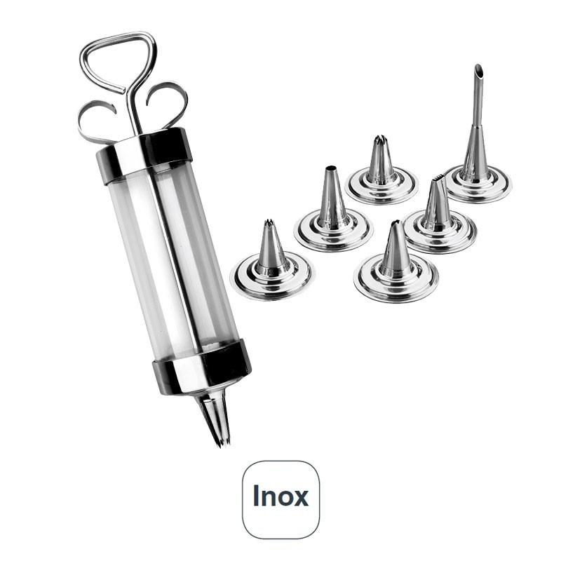 Pistola de 250 ml fabricada con acero inoxidable con 6 boquillas del mismo material ideal para decorar o rellenar elaboraciones de repostería.