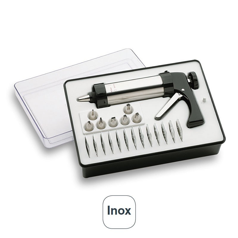 Estuche con pistola de 250 ml fabricada en acero inoxidable más set de boquillas y accesorios para decorar o rellenar productos de repostería.