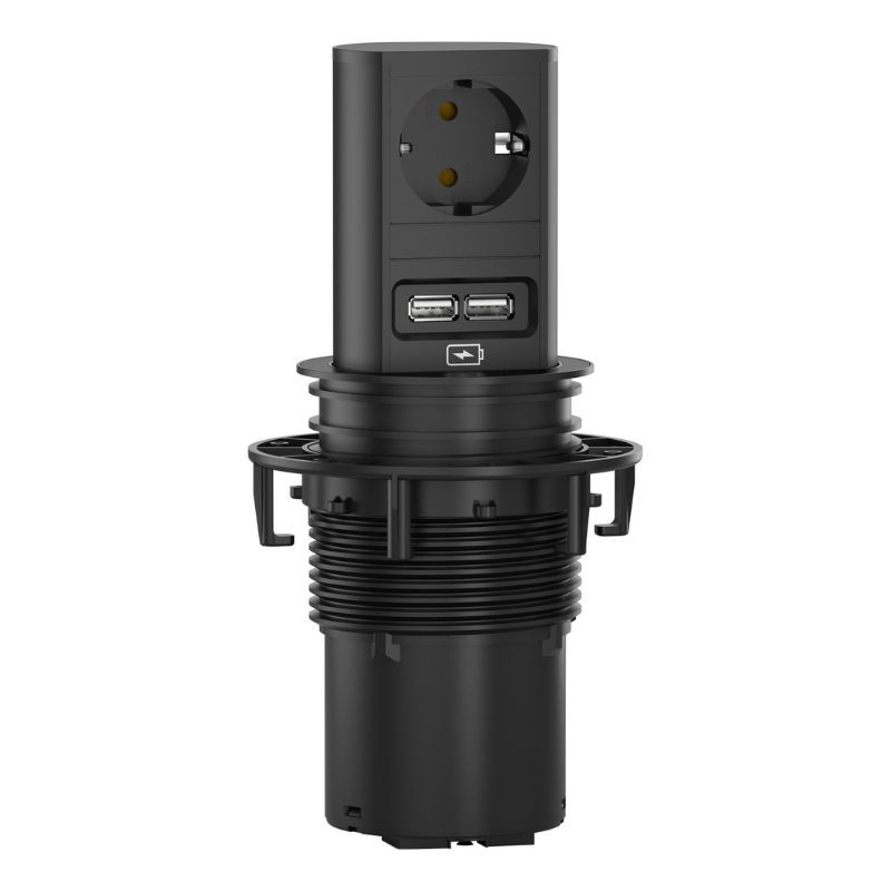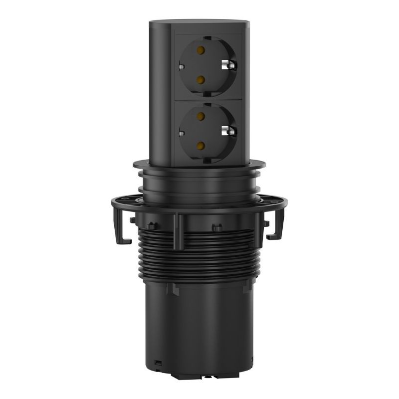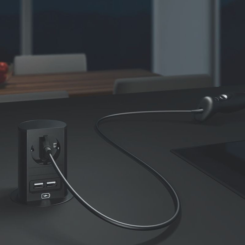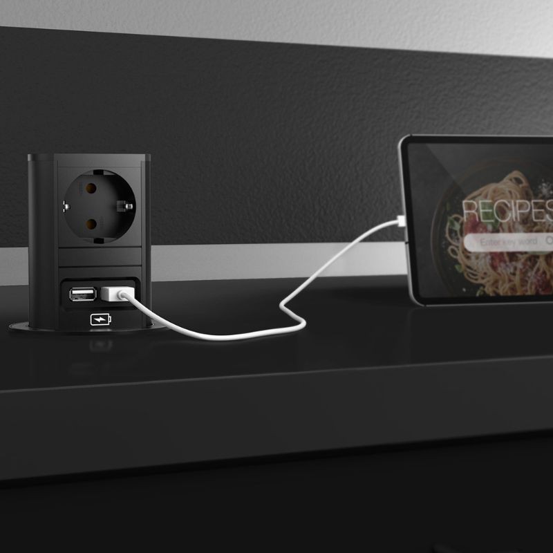 La torre de enchufes para cocina Elevator negro mate, es ideal para instalar en encimeras, aunque se adapta de forma óptima a cualquier entorno. Resulta muy adecuado cuando se trata de integrar conexiones de corriente y datos en el espacio más pequeño.