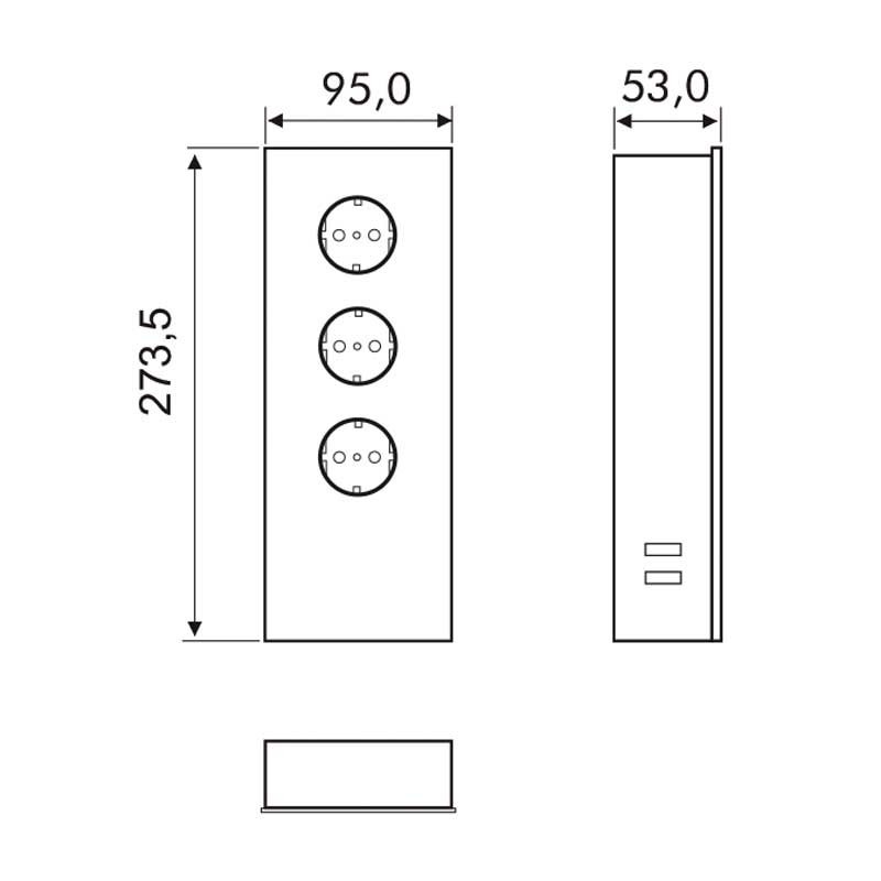 Torre de enchufes vertical para cocina Power Glass con 3 tomas de red Schuko y 2 puertos USB de carga. Acabado frontal en cristal blanco y carcasa en acero inox.