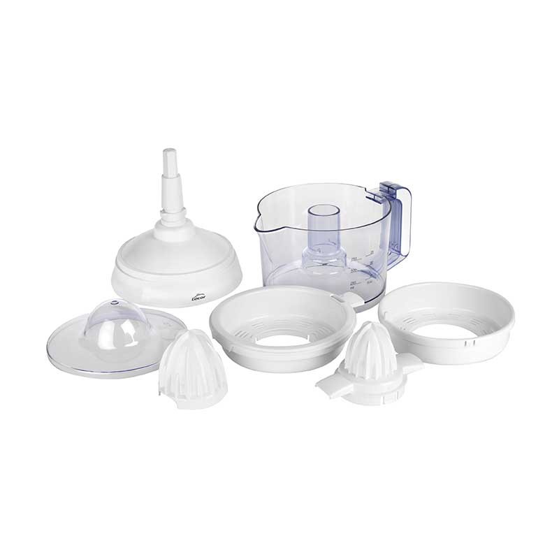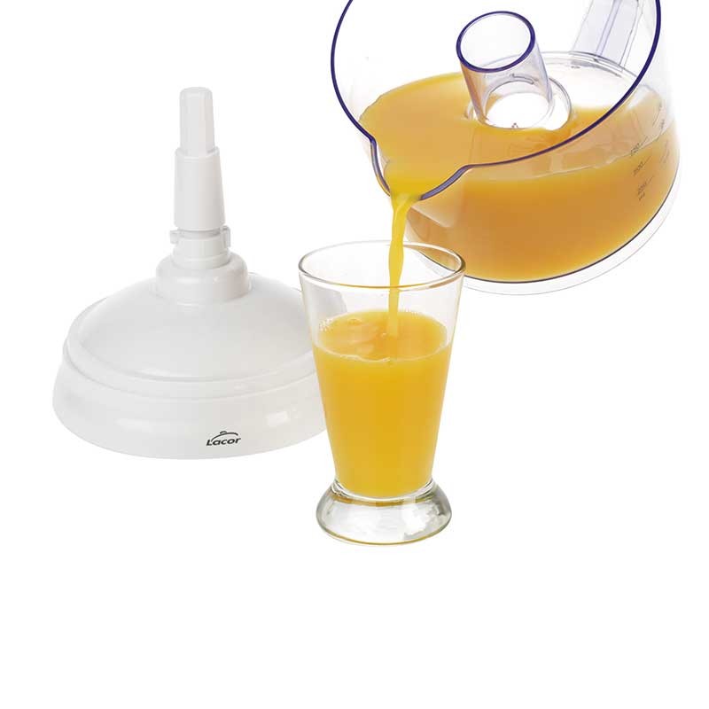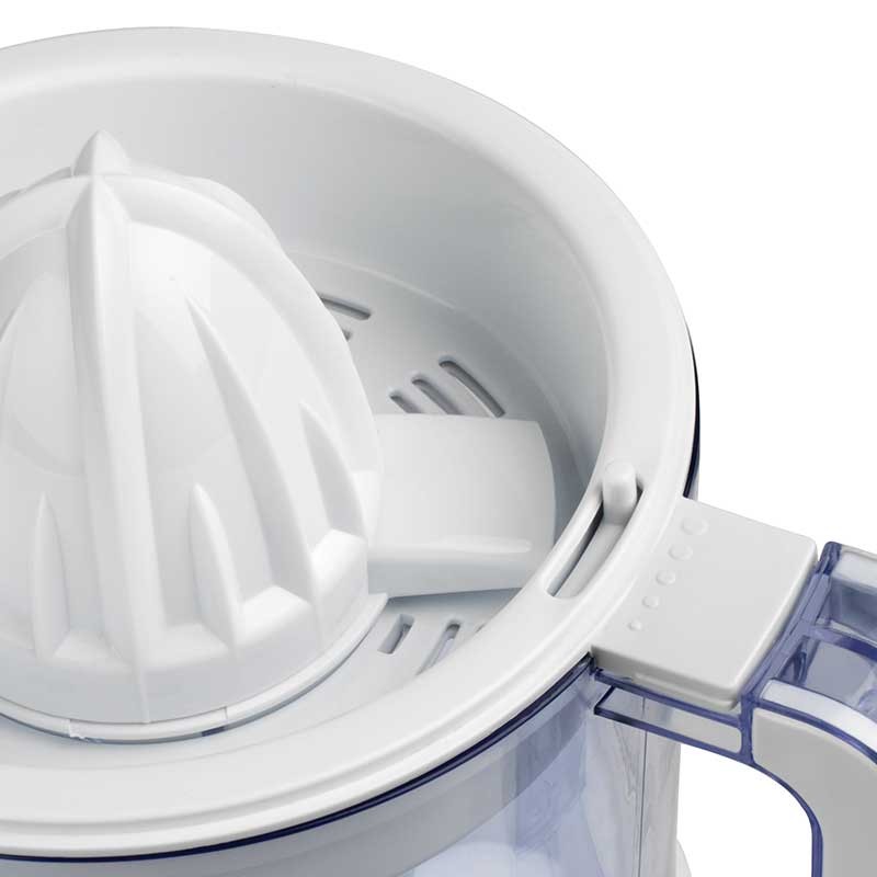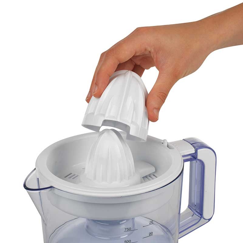 Exprimidor de zumo con 2 conos intercambiables de distintos tamaños para exprimir diferentes tamaños de fruta.