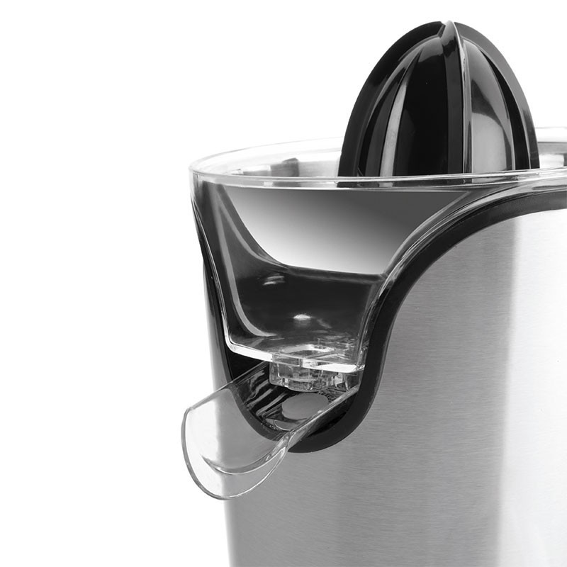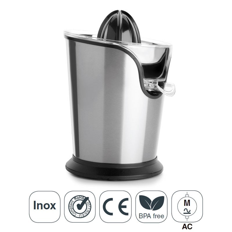 Exprimidor de naranjas eléctrico de 85 W fabricado en acero inoxidable de gran calidad y excelente resistencia a la corrosión.