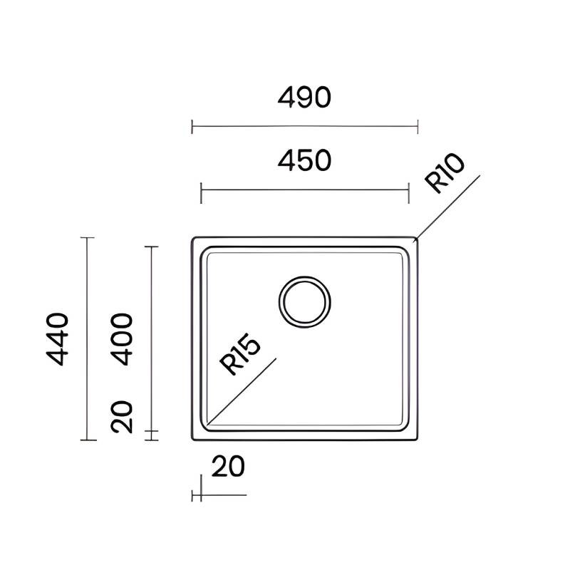 Fregadero de acero inoxidable modelo Ferrara Plus de 490 x 440 mm para instalación bajo encimera, óptica enrasada o filotop a elegir.