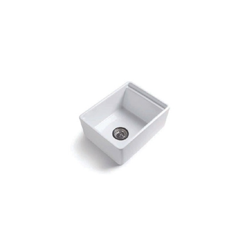Fregadero de cerámica blanca modelo JAR 15 de 590 x 458 mm para instalación bajo encimera o sobre encimera.