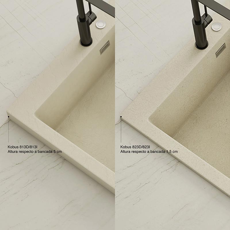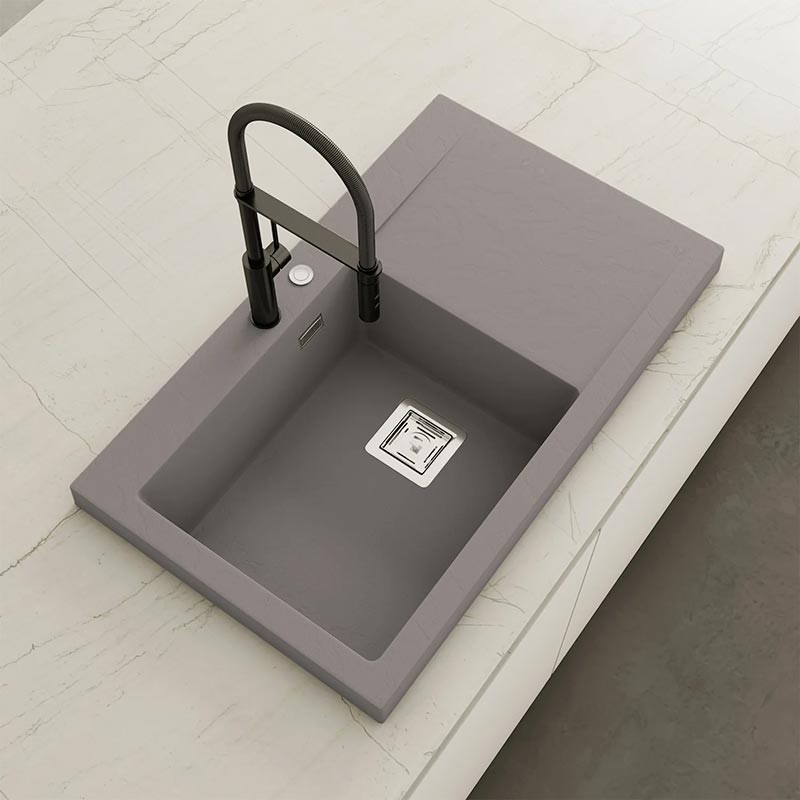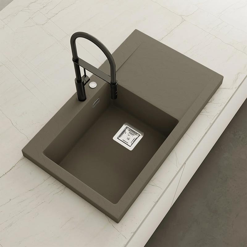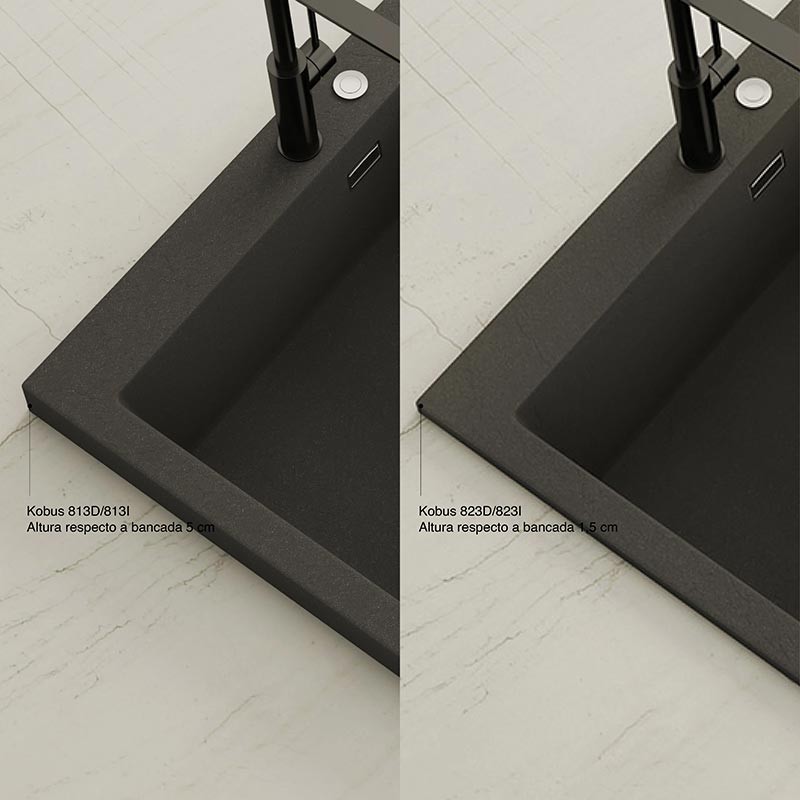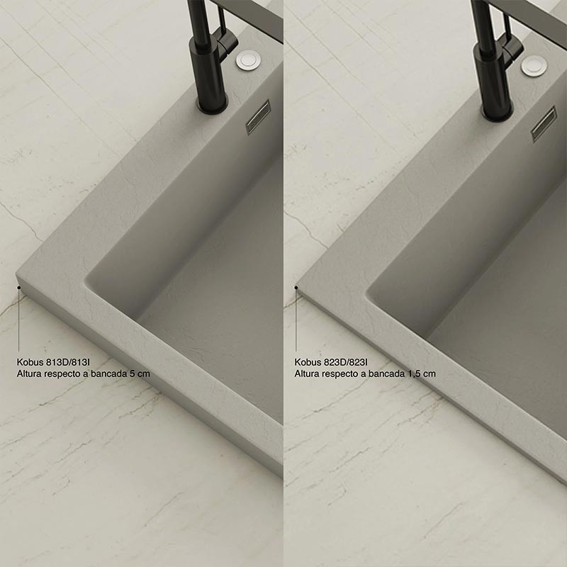Fregadero de granito Hekla® modelo Kobus con textura pizarra mate. Diseñado para instalación sobre encimera en muebles a partir de 60 cm.