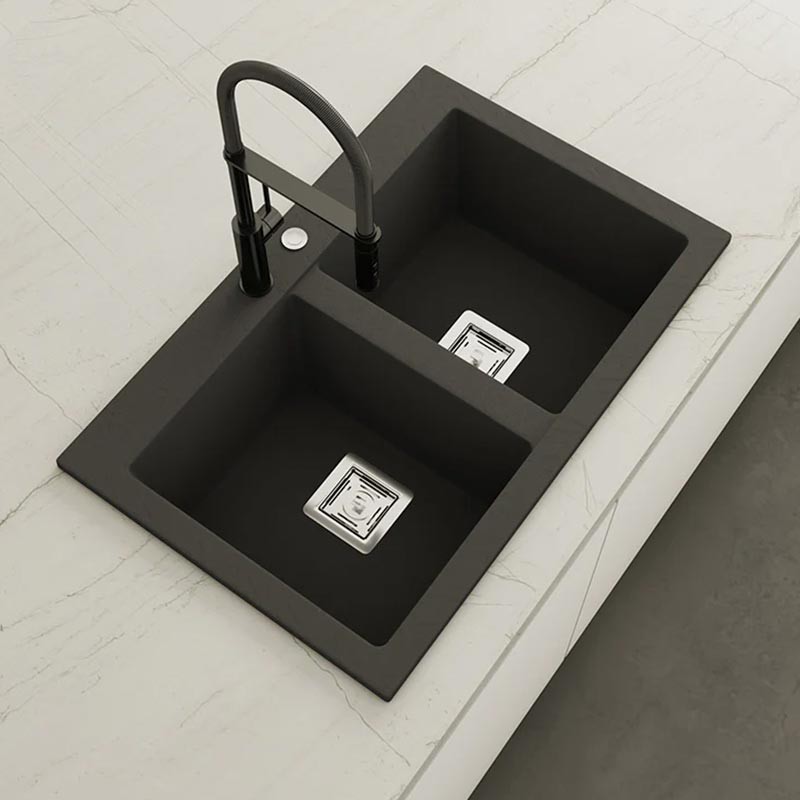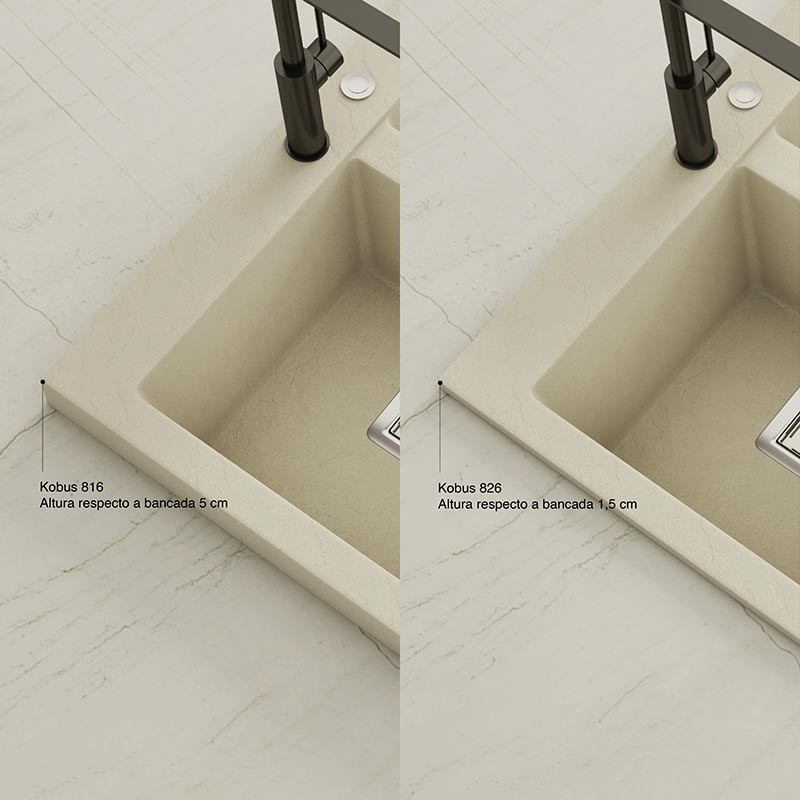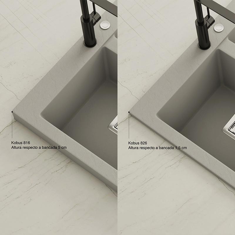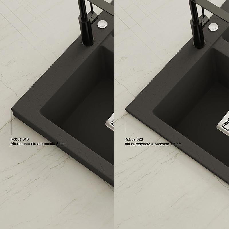 Fregadero de granito Hekla® modelo Kobus con textura pizarra mate. Diseñado para instalación sobre encimera en muebles a partir de 80 cm.