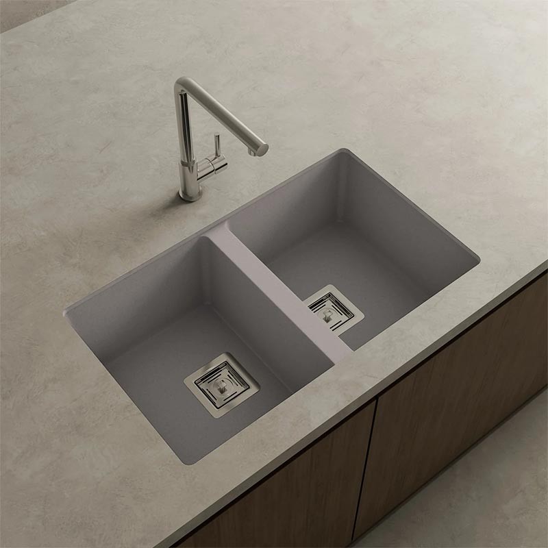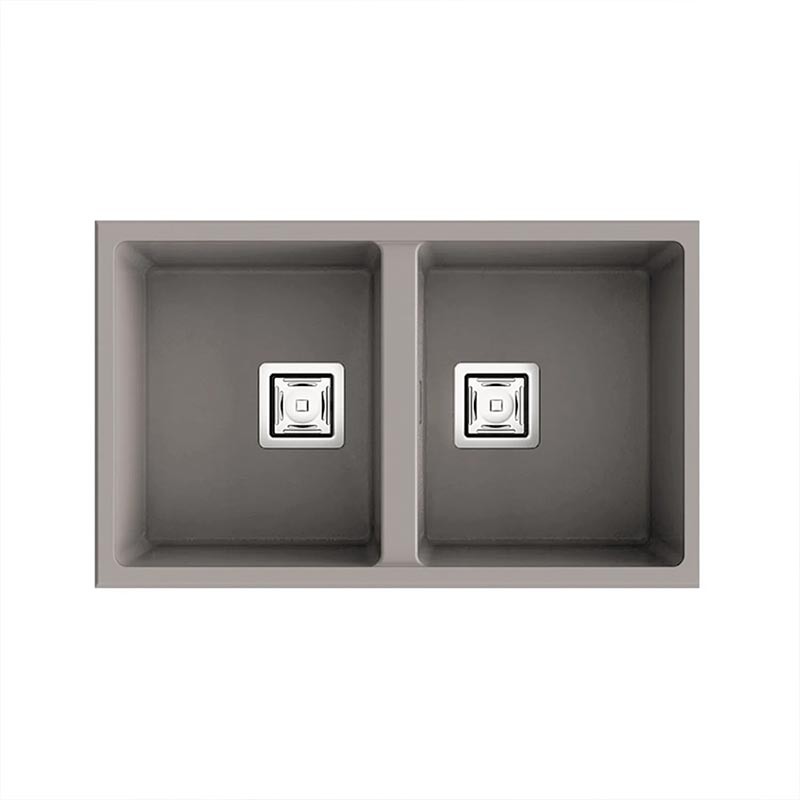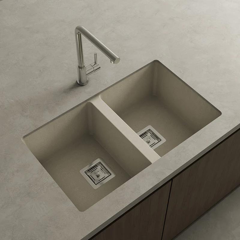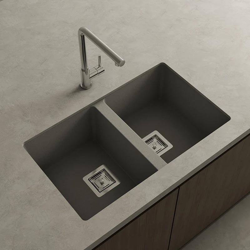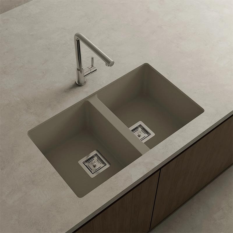Fregadero de granito Hekla® modelo Zie 70 de dos cubetas acabado mate diseñado para instalación bajo encimera o sobre encimera en muebles de 80 cm mínimo.