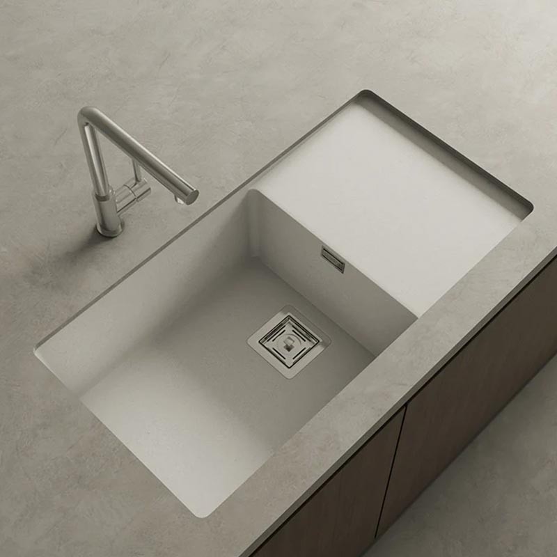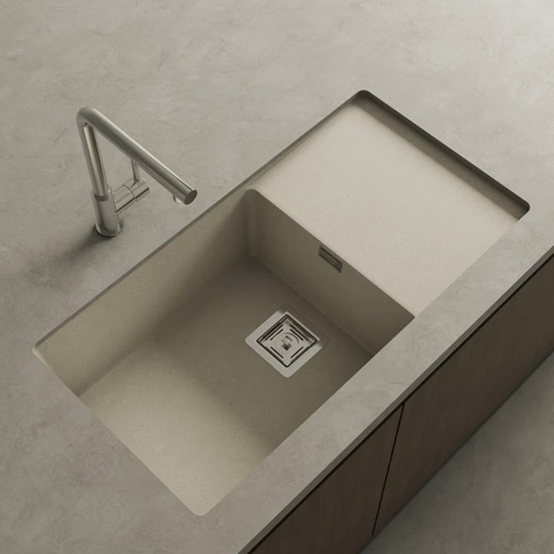 Fabricado por Poalgi en su material en masa Hekla®, este fregadero de granito ofrece versatilidad y una zona de trabajo resistente a factores externos.