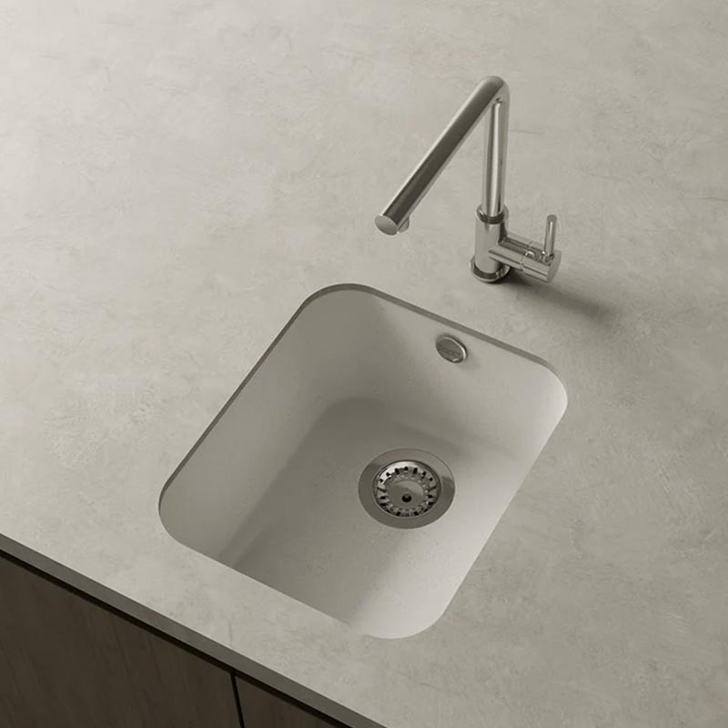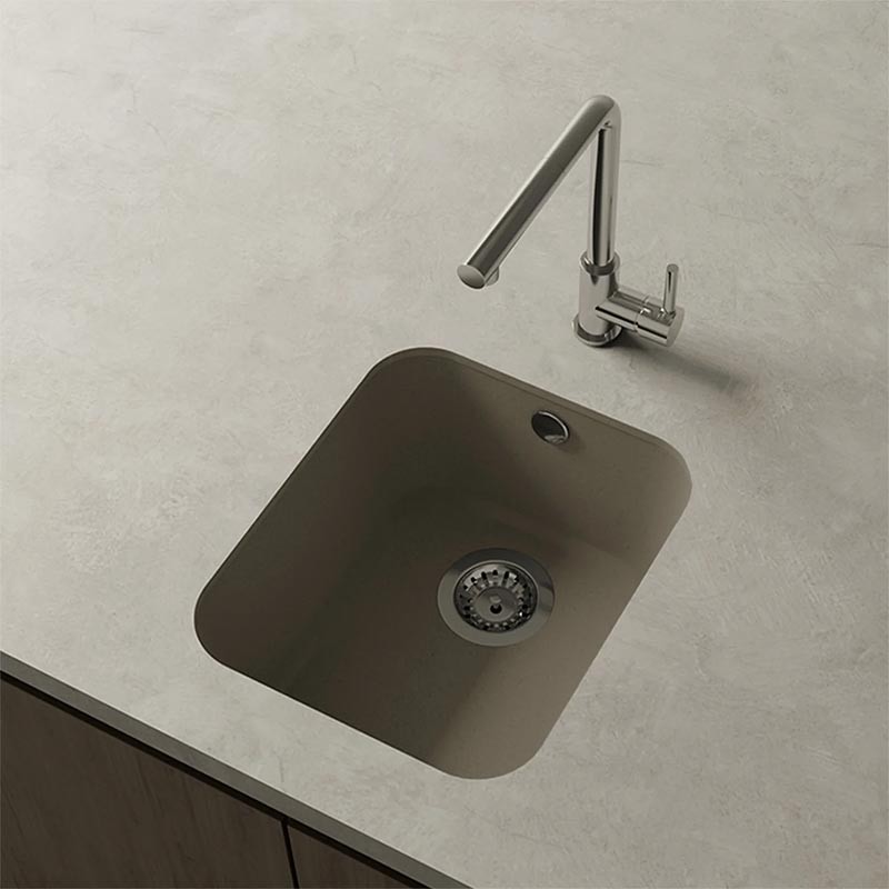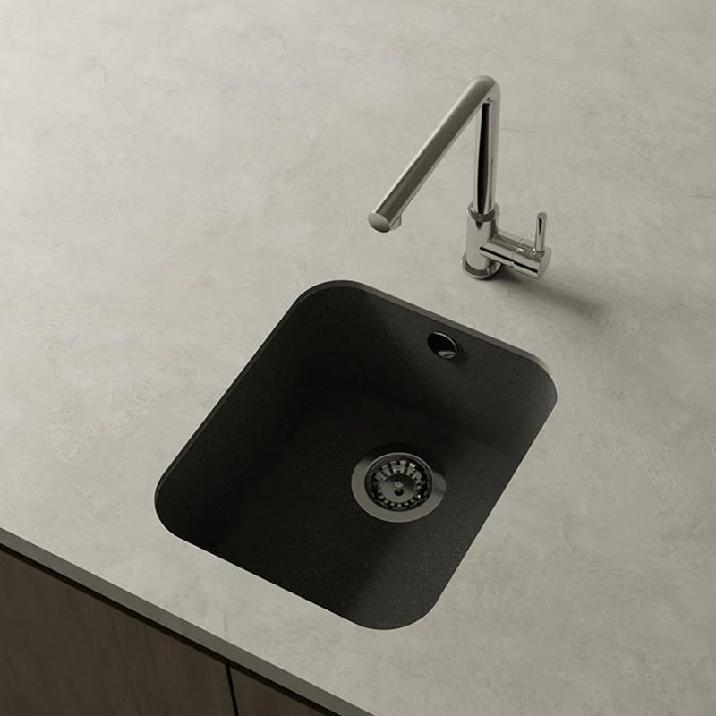 Fregadero de granito Hekla® modelo Gandia acabado mate diseñado para instalación bajo encimera o sobre encimera en muebles a partir de 45 cm.