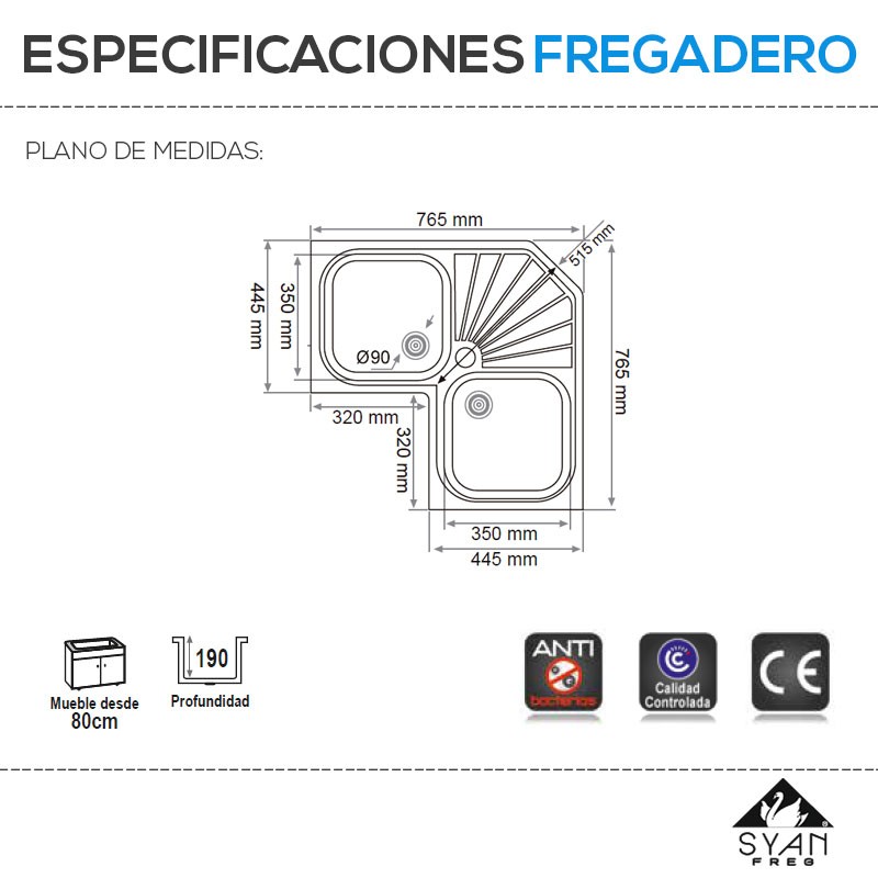 Fregadero de cocina doble con escurridor para montaje en rincón sobre encimera modelo Ícaro de 76,5x76,5 cm fabricado en resina sintética en diferentes colores a elegir.