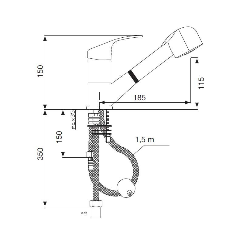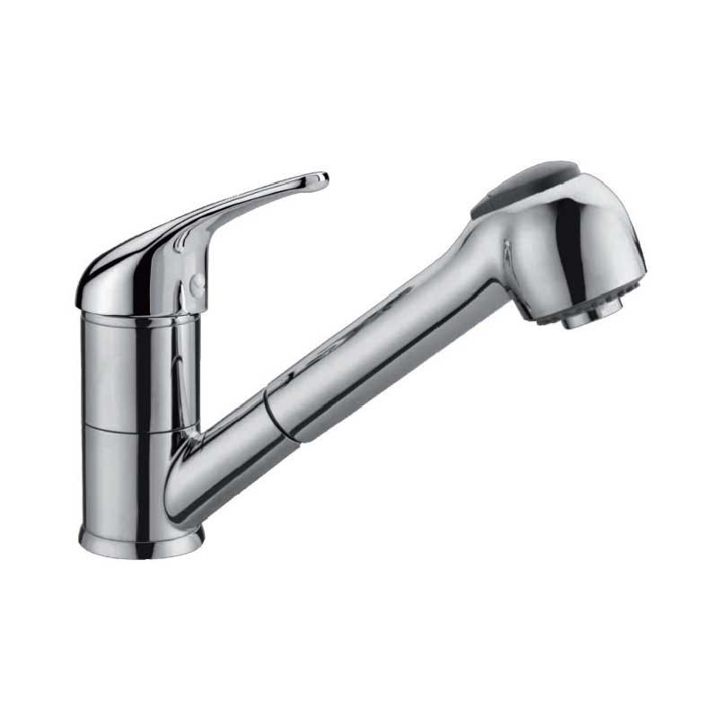 Grifo monomando de caño bajo con ducha extraible modelo Norma de 15 cm de altura y acabado cromado para fregadero de cocina. Cartucho cerámico de 40 mm. Instalación vertical sobre repisa.
