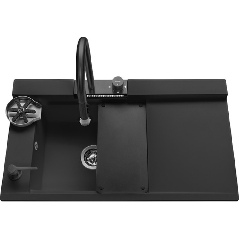 El fregadero sobre encimera multifunción Shiva, en color negro, incluye un grifo extraíble e integra recursos innovadores para un uso óptimo en el día a día con todo lo que necesitas en la cocina.