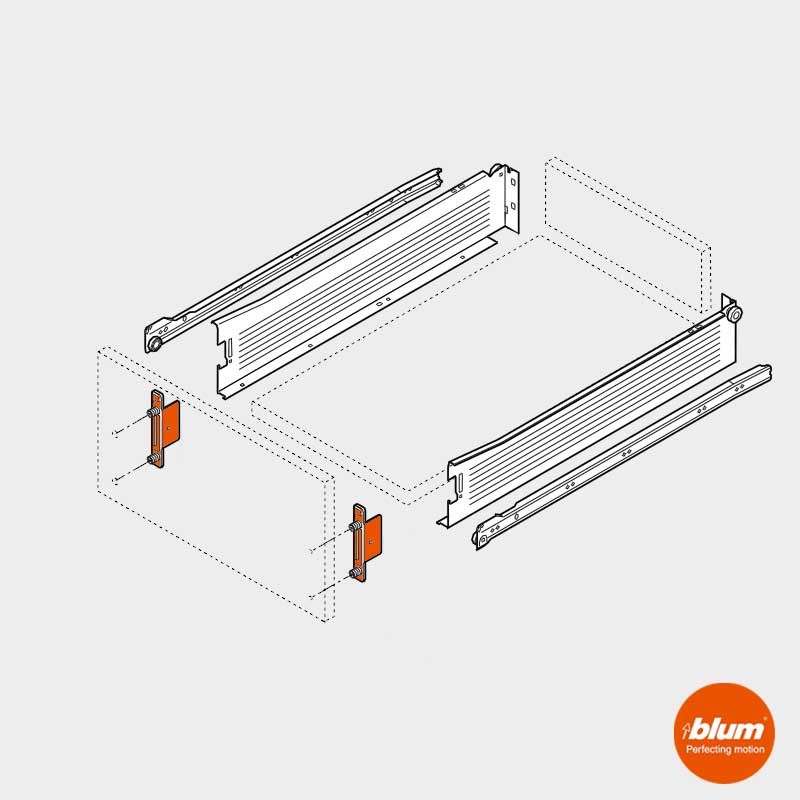 Fijaciones frontales con tornillos para cajones Blum Metabox. Compatible con todos los modelos excepto Metabox altura N 54 mm. Contenido: 2 uds.