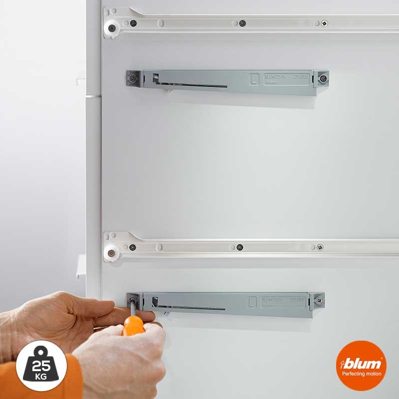 Para cajones de hasta 900 mm de ancho bastará con un sólo mecanismo acoplado en uno de los laterales del cajón. En caso de cajones más grandes, será necesaria la utilización de 2 dispositivos, uno por lateral, para un correcto funcionamiento.