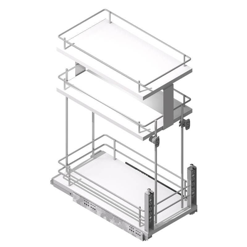 Módulo de extracción frontal para mueble de cocina fabricado en acero cromado con 3 estantes con bases de melamina blanca para guardar botellas, botes y otros artículos.
