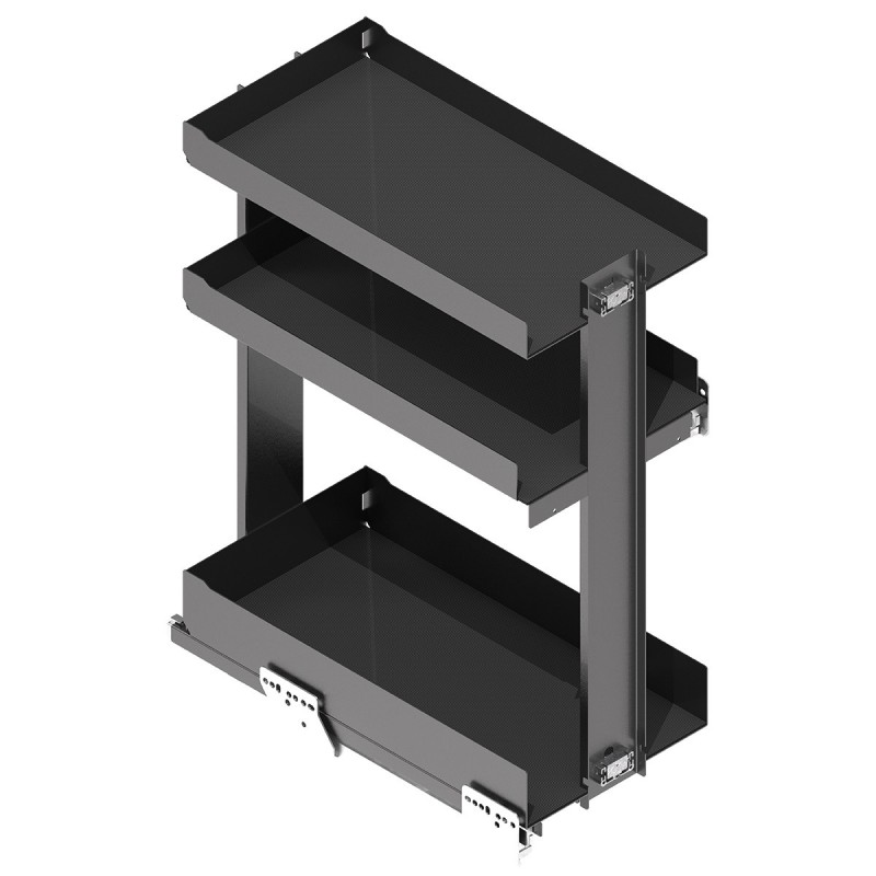 Botellero extraible de 3 alturas Nova Flat en acero acabado antracita con bases de antideslizantes, guías basales ocultas, extracción total y cierre amortiguado.